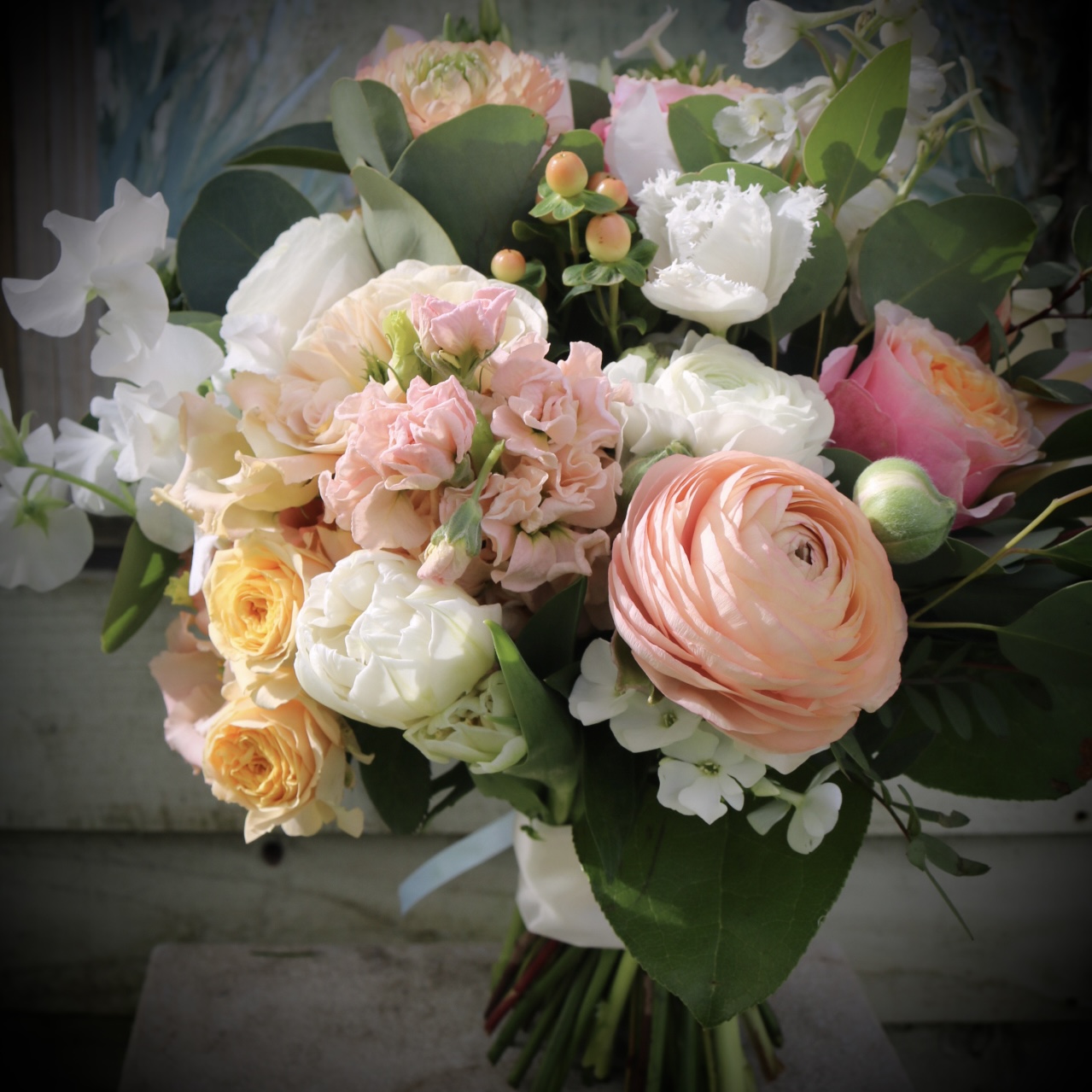 Alchemilla, Astilbe, Forget-me-not, Forsythia, Freesia, Hyacinths, Hydrange, Lisianthus, Stocks, Nigella, Sweet pea, Tulips and Veronica