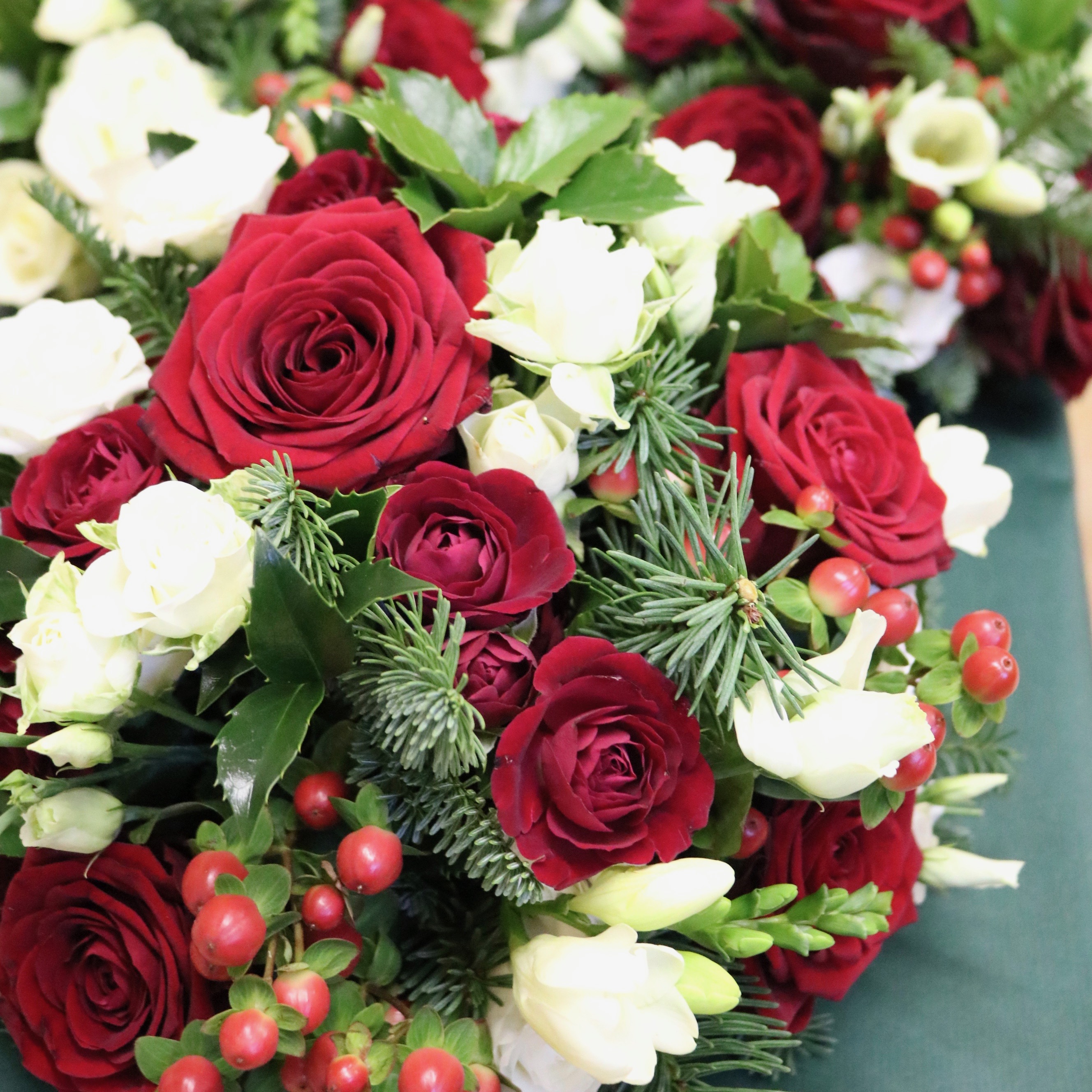 This is the month of festivities and celebration. Reds, greens and whites are popular colours for this time of the year with berries, holly and ivy being available.